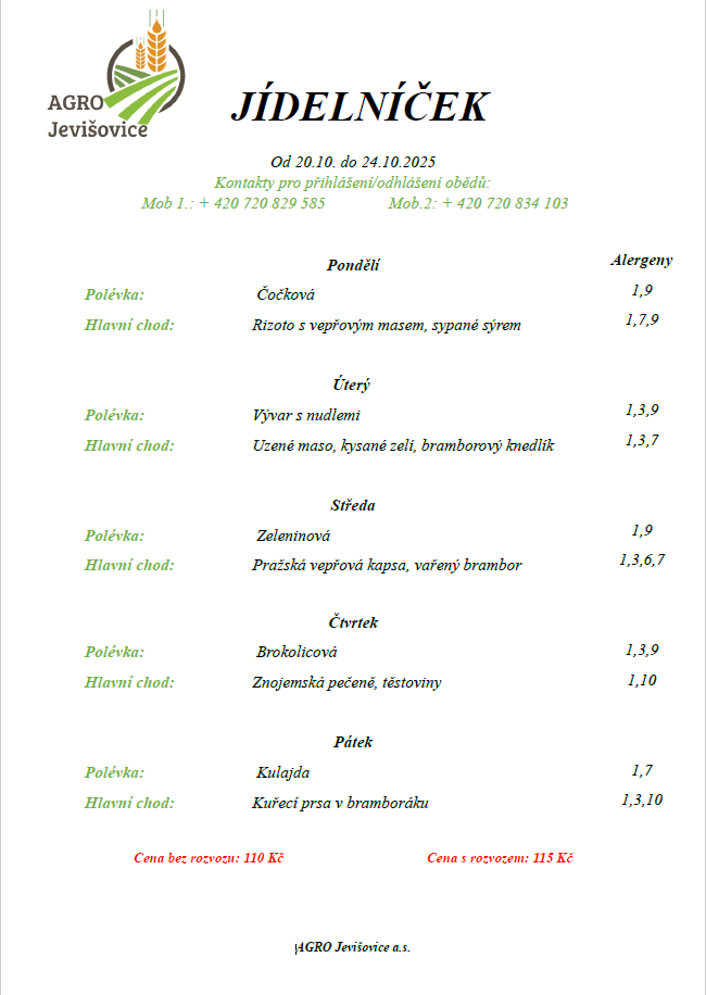 Tento nový objednávkový systém bude platit i pro strávníky, kteří si chodí pro obědy osobně do kuchyně, rovněž pro zaměstnance společnosti AGRO Jevišovice, a. s.