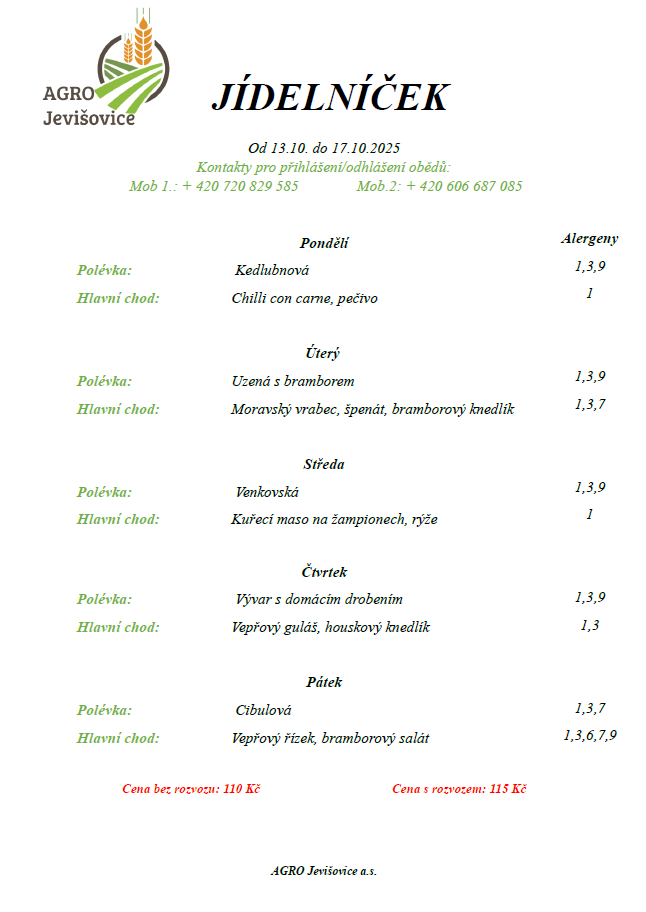 Tento nový objednávkový systém bude platit i pro strávníky, kteří si chodí pro obědy osobně do kuchyně, rovněž pro zaměstnance společnosti AGRO Jevišovice, a. s.
