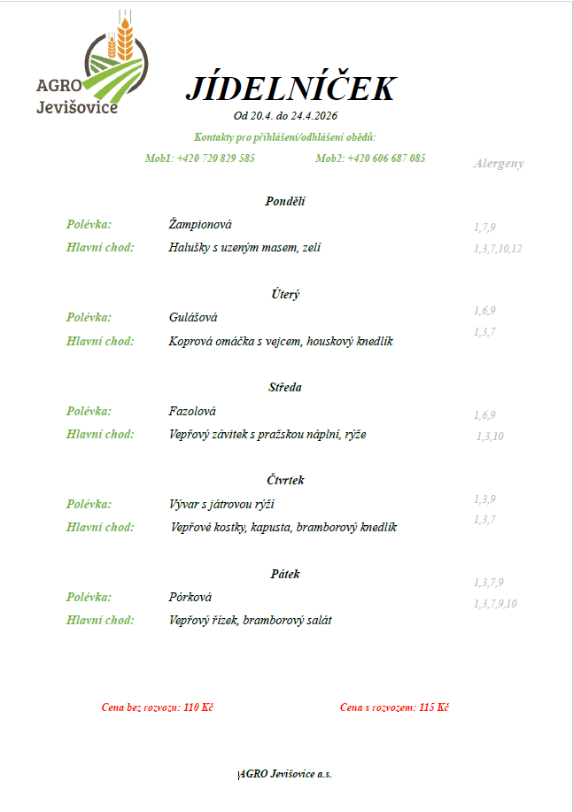Tento nový objednávkový systém bude platit i pro strávníky, kteří si chodí pro obědy osobně do kuchyně, rovněž pro zaměstnance společnosti AGRO Jevišovice, a. s.