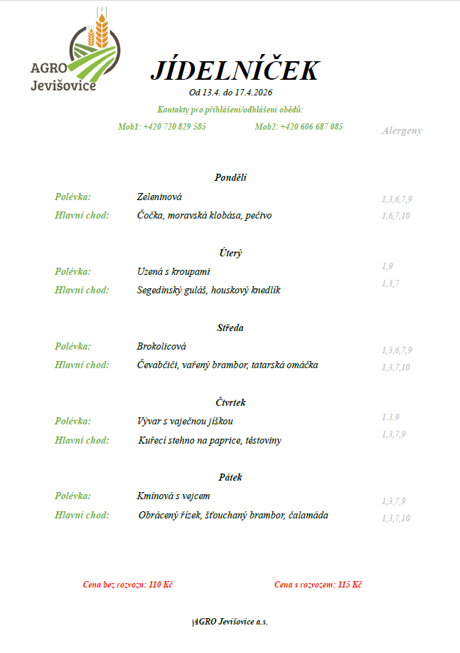 Tento nový objednávkový systém bude platit i pro strávníky, kteří si chodí pro obědy osobně do kuchyně, rovněž pro zaměstnance společnosti AGRO Jevišovice, a. s.